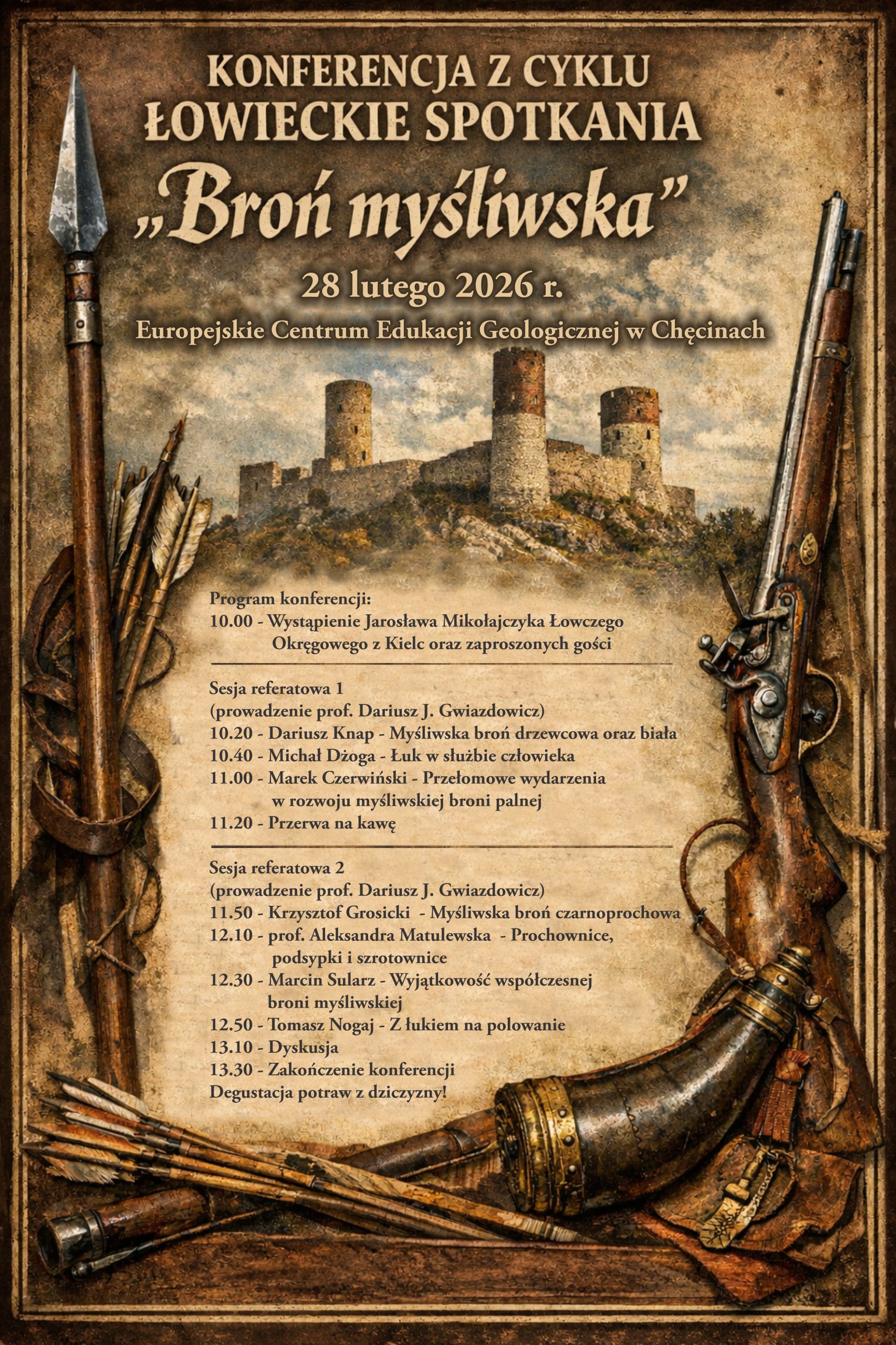Zapraszamy na wyjątkową konferencję poświęconą historii, rozwojowi i znaczeniu broni myśliwskiej na przestrzeni dziejów. Wydarzenie odbędzie się 28 lutego 2026 roku w Europejskim Centrum Edukacji Geologicznej w Chęcinach.
